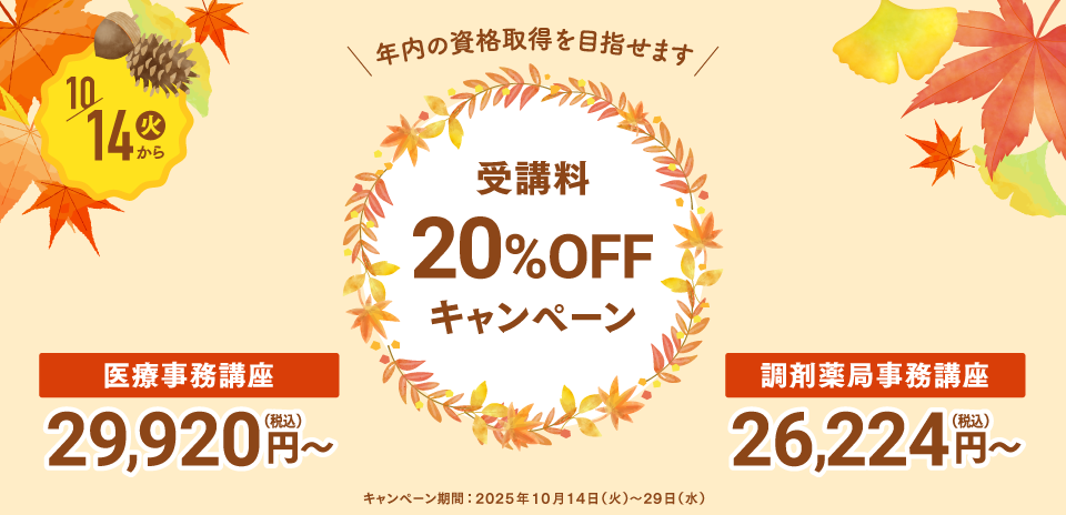 10月14日(火)より、医療事務講座・調剤薬局事務講座の受講料が20%OFFになるキャンぺーンを開始します。