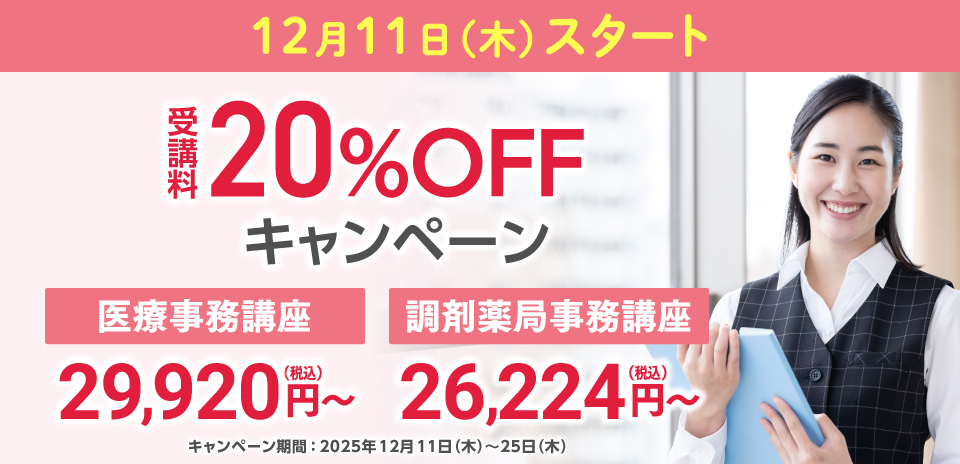 12月11日(木)より、医療事務講座・調剤薬局事務講座の受講料が20%OFFになるキャンぺーンを開始します。